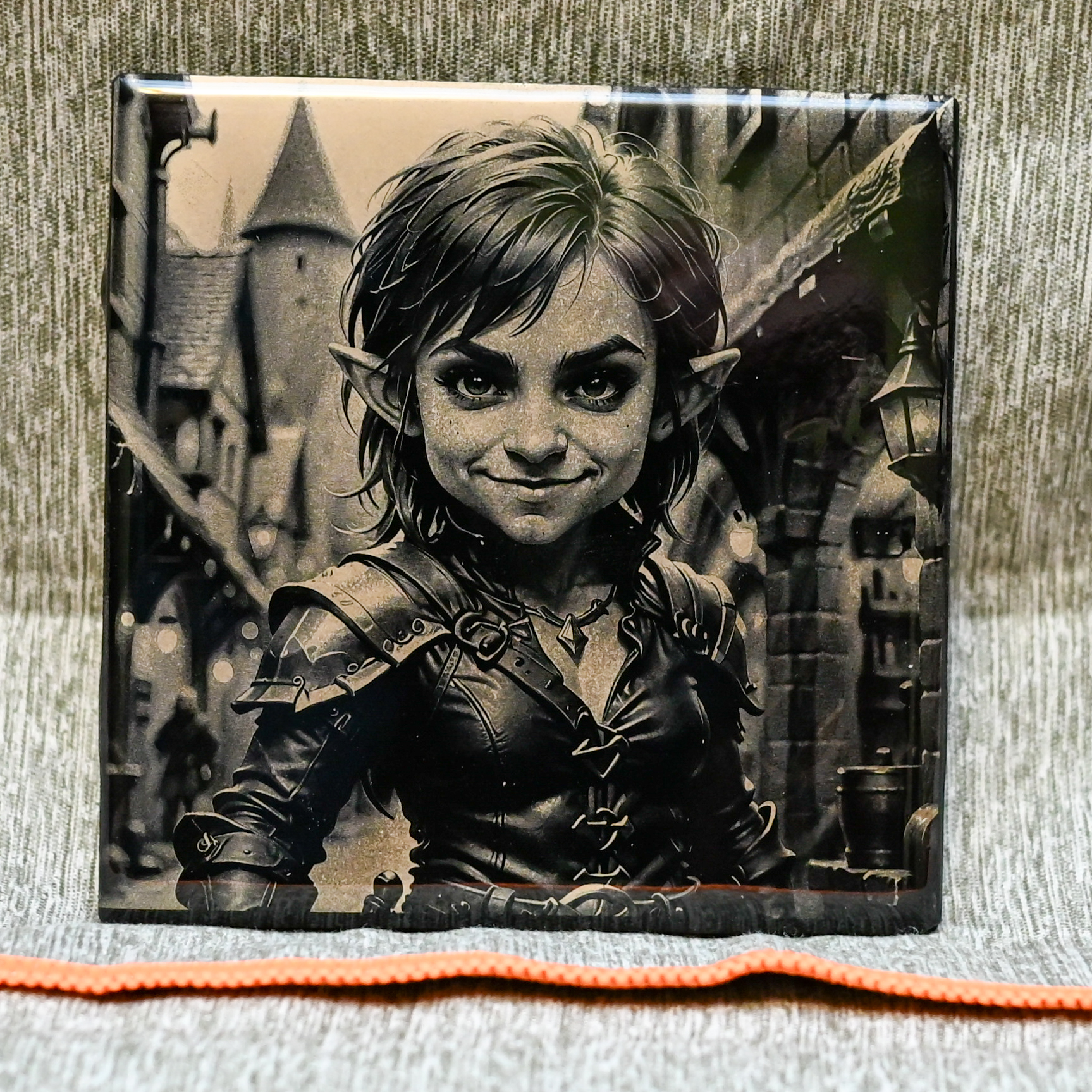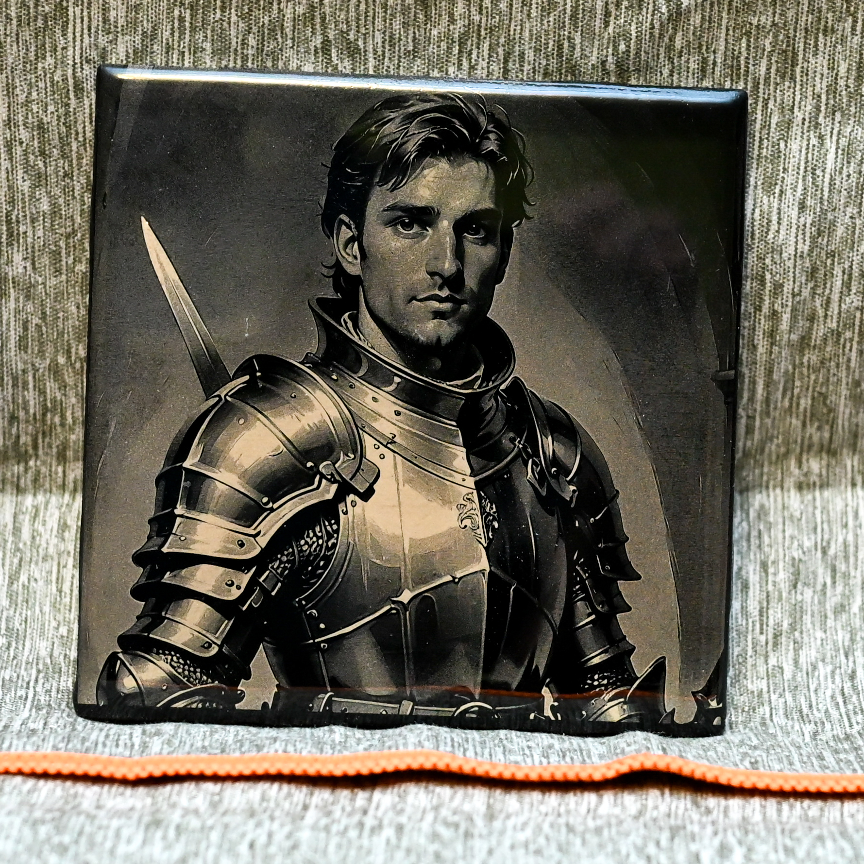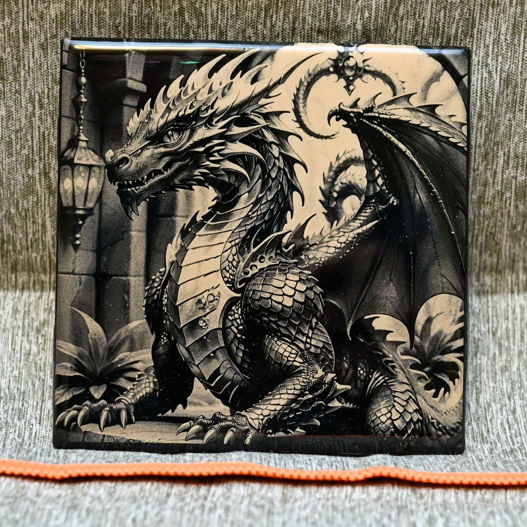After selecting the image, we convert it into black and white while adding subtle lighting enhancements to ensure the final result complements the tile medium. Using advanced laser technology, we delicately engrave your image by removing layers of black paint to reveal the intricate details of your provided photograph. This process captures the essence of your image with precision and clarity.
